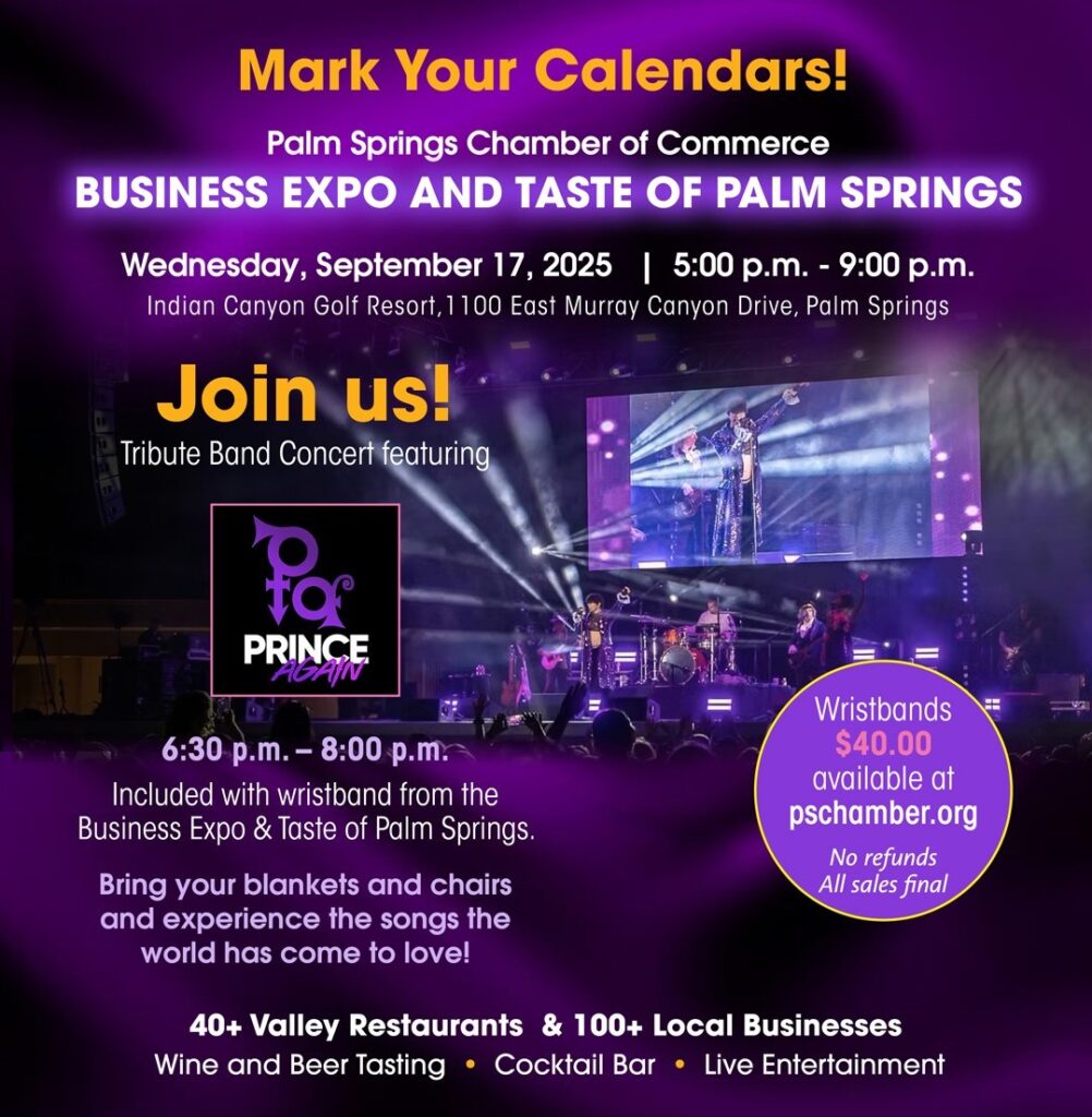 Annual Business Expo & Taste of Palm Springs. Explore 100+ local businesses, savor bites from 40+ restaurants, and enjoy wine & beer tastings throughout the evening. Your wristband also includes live entertainment, featuring Prince Again — the #1 Tribute to Prince.